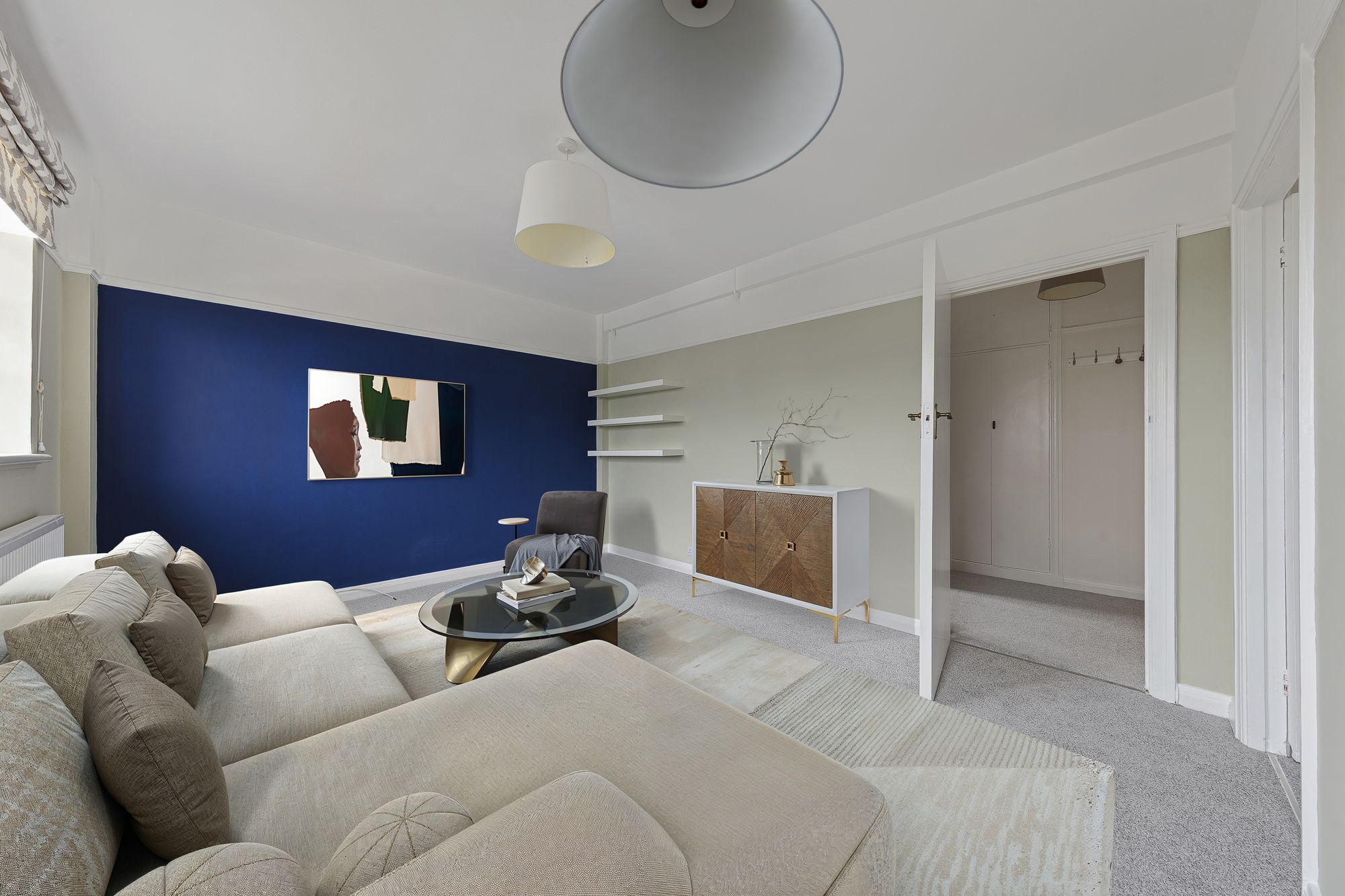 The flat’s position on the fourth floor affords it fantastic views and makes it a bright space, especially in the first half of the day, due to its eastern aspect. The reception room is nicely proportioned with those large windows you’d expect from an art-deco building, creating a bright space that feels instantly welcoming. The soft sage green walls complement the natural light, while the neutral carpet provides a practical and comfortable base.